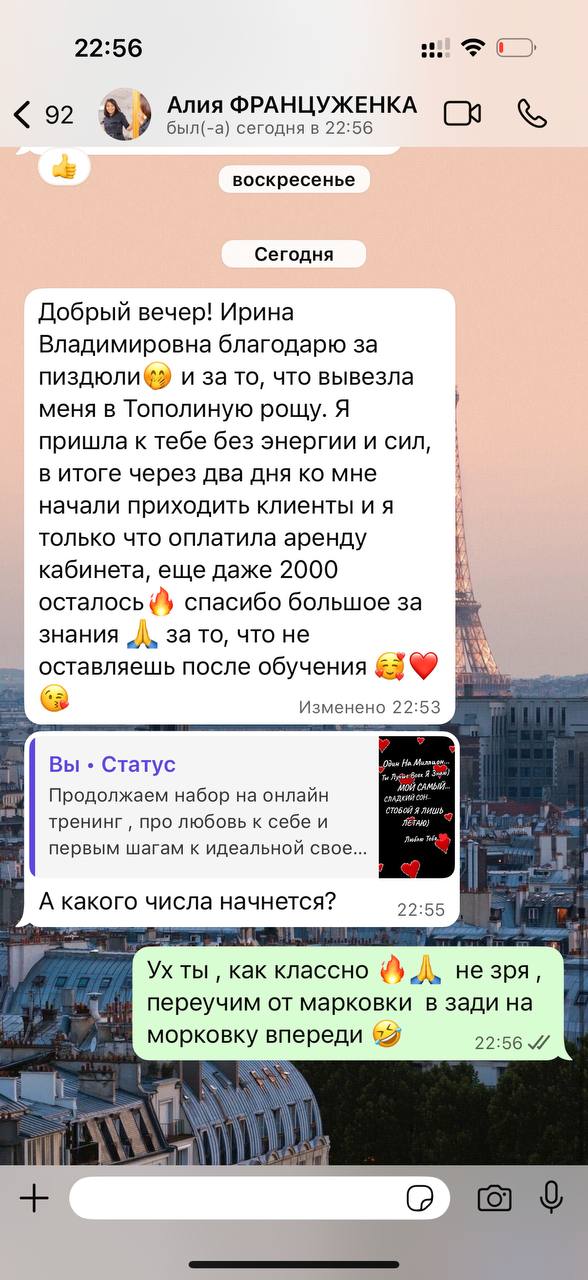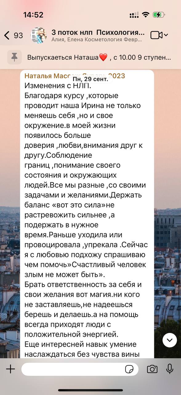 Вы смотрите видеоуроки, читаете теорию, отработка техник на родных и близких, личные созвоны с разборами практических и психологических моментов.