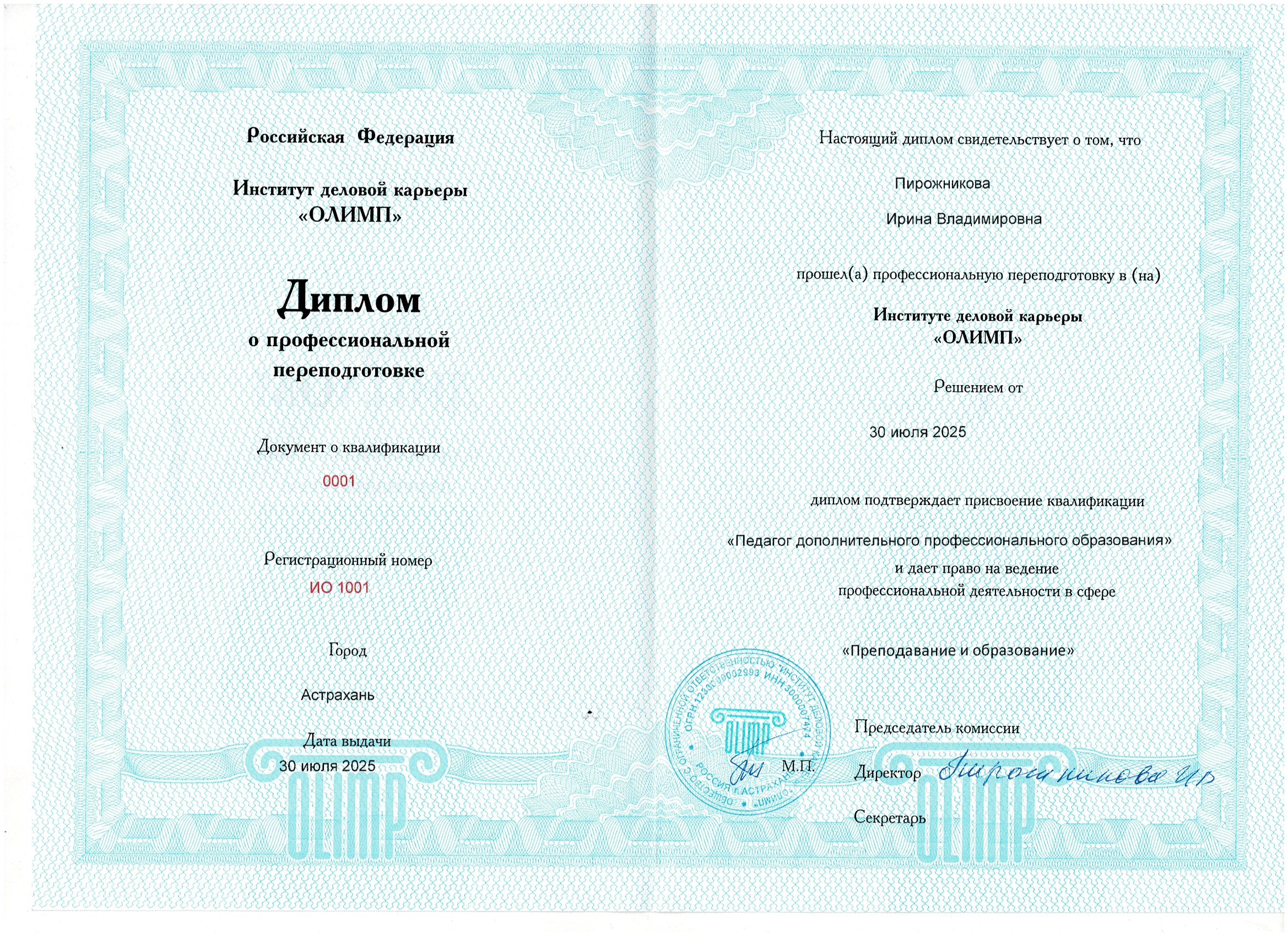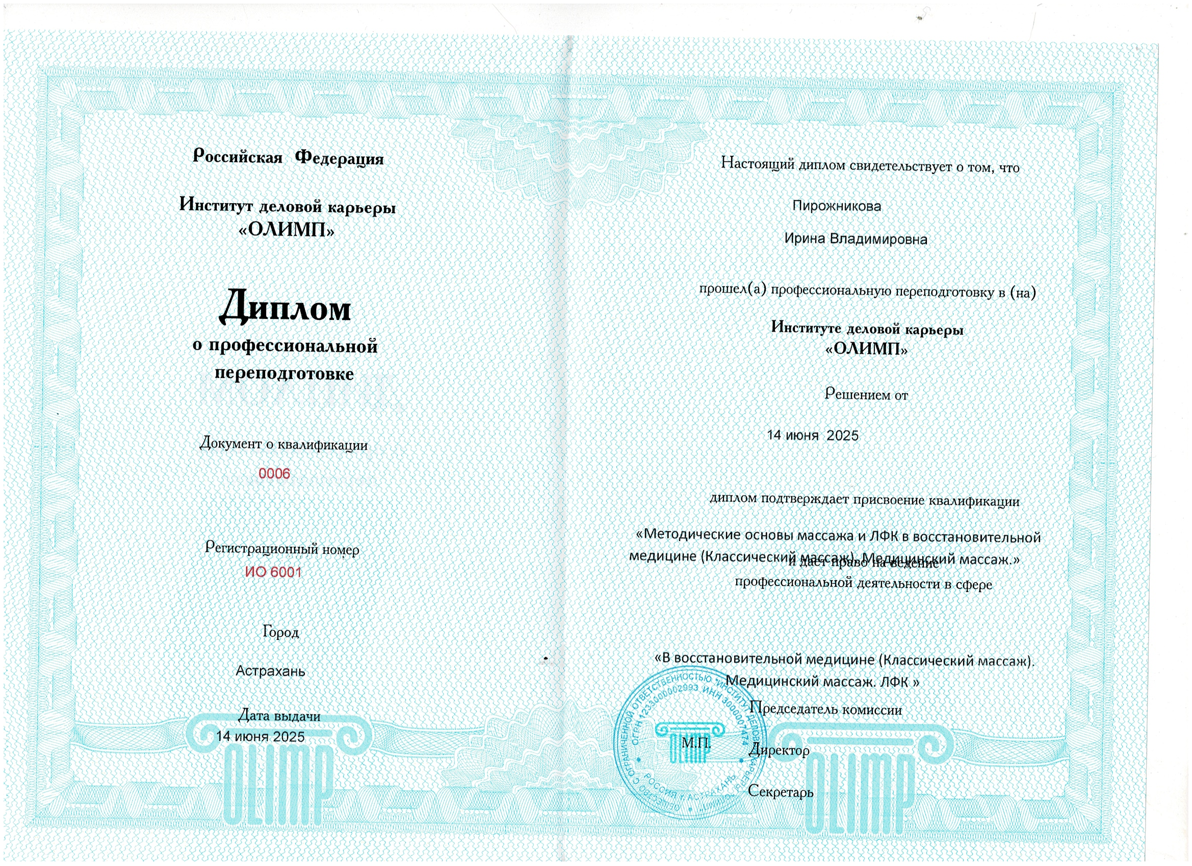 Диплом - если вы выбрали полный курс , 250 часов ,но у вас есть высшее или среднее образование. С внесением в ФИС ФРДО .